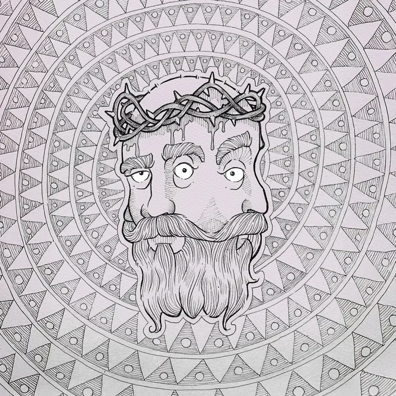 Sein Blick schweifte unstet, als hätte er in eine Wahrheit geblickt, die nicht für Sterb­li­che bestimmt war. Dornen rankten sich um sein Haupt, doch aus den Wunden floss kein Blut – nur flüssige Gedanken. Um ihn herum pulsierte ein endloses Mandala, ein Kosmos aus Mustern, die sich immer weiter in sich selbst drehten.